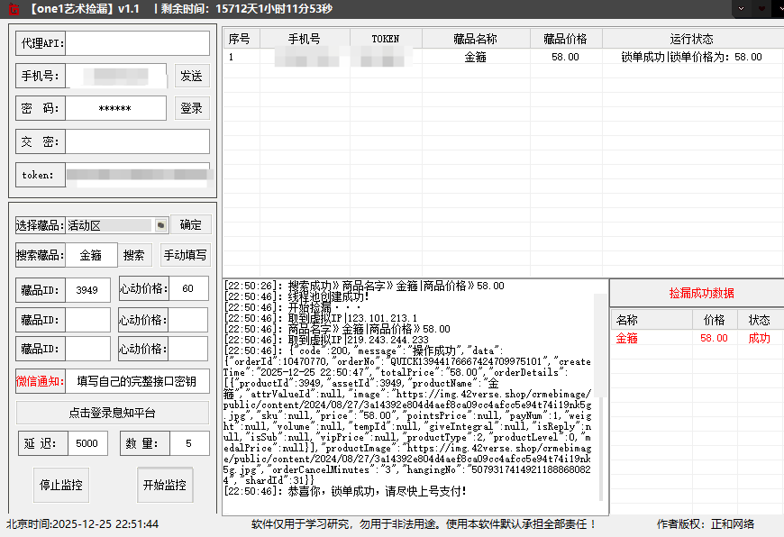 软件说明:手动填写验证码,填写密码位置,选择登陆,多藏品、多线程价格监控,搜索藏品,自动填写藏品ID,设置价格。