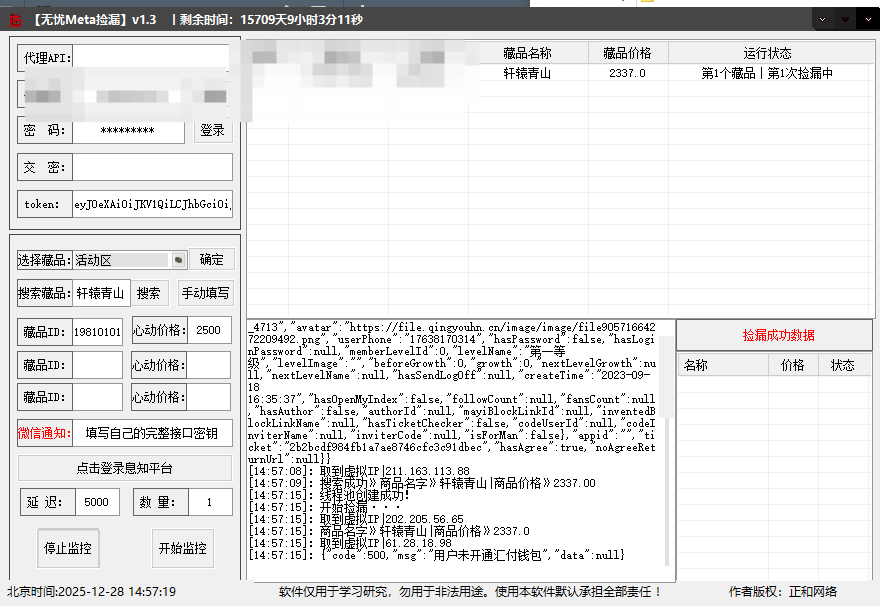 软件说明:填写账号密码登陆,多藏品、多线程价格监控,搜索藏品,自动填写藏品ID,设置价格。