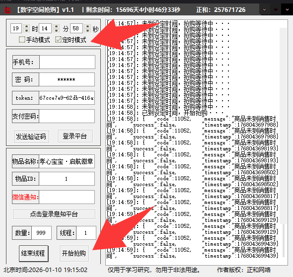 软件说明:孝心宝宝·启航徽章2026-01-11 10:00开售,账号验证码登陆,验证码填写密码框,默认ID,设置定时,开始即可